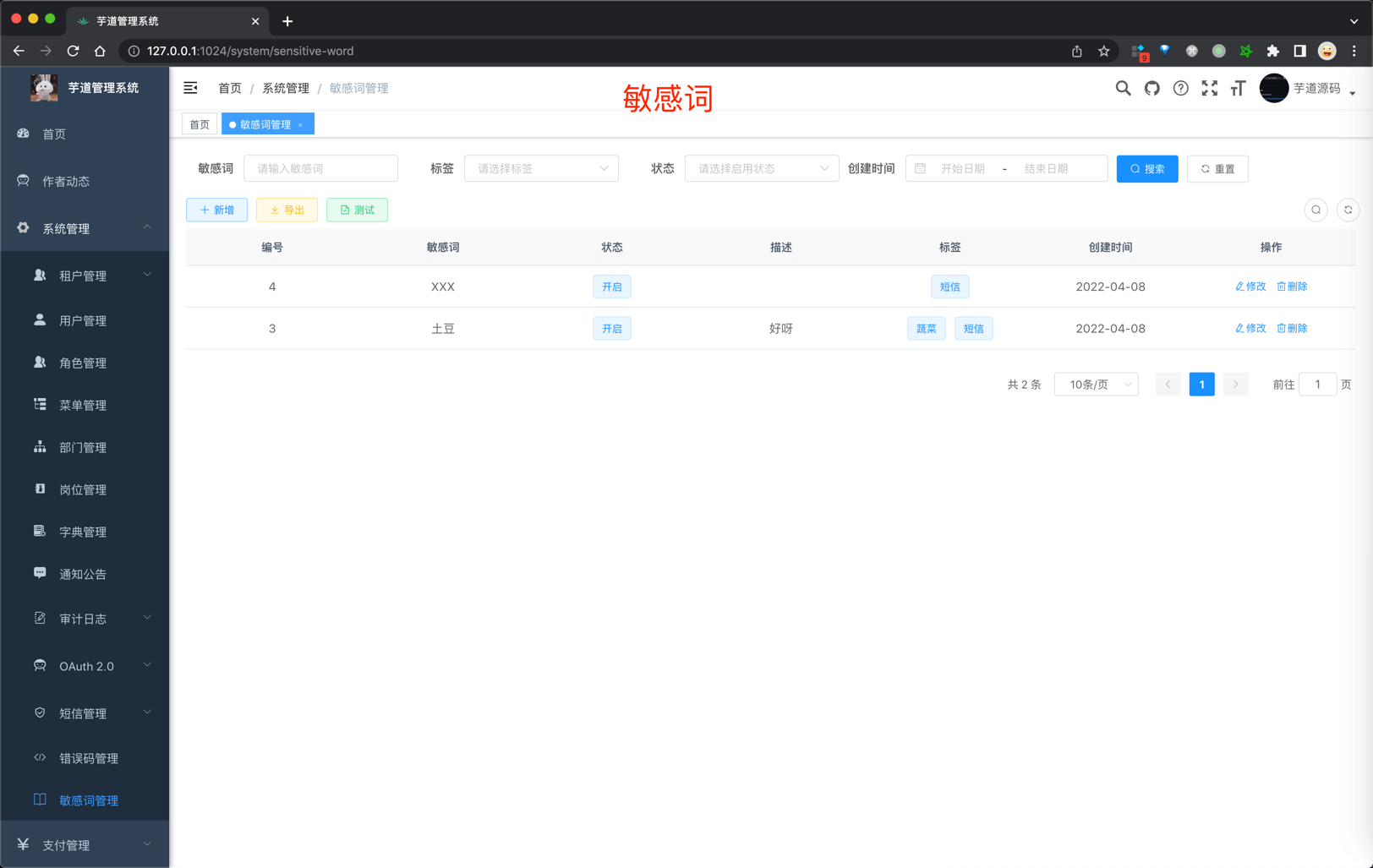 | 菜单管理 | 配置系统菜单、操作权限、按钮权限标识等,本地缓存提供性能 | |